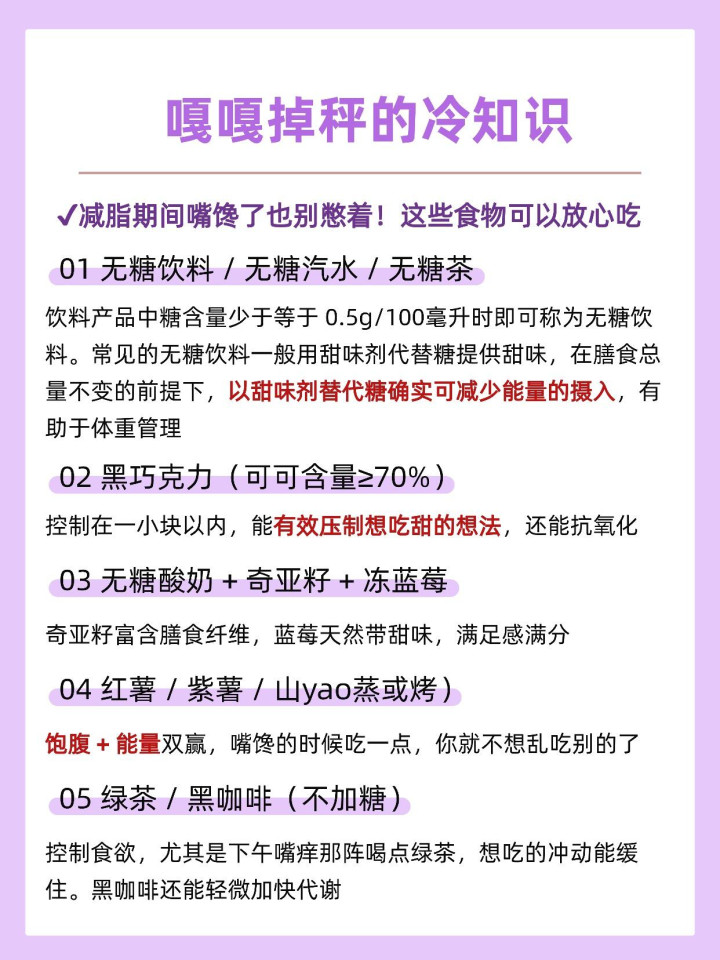 其实减肥真的不用 “苦哈哈”!饿了可以吃、想吃甜的也有替代品,关键是找对方法。这篇就整理了超实用的减脂冷知识,还有能放心吃的 “解馋清单”,不用饿肚子、不用戒口腹之欲,一起轻松瘦下来~秤不掉营养