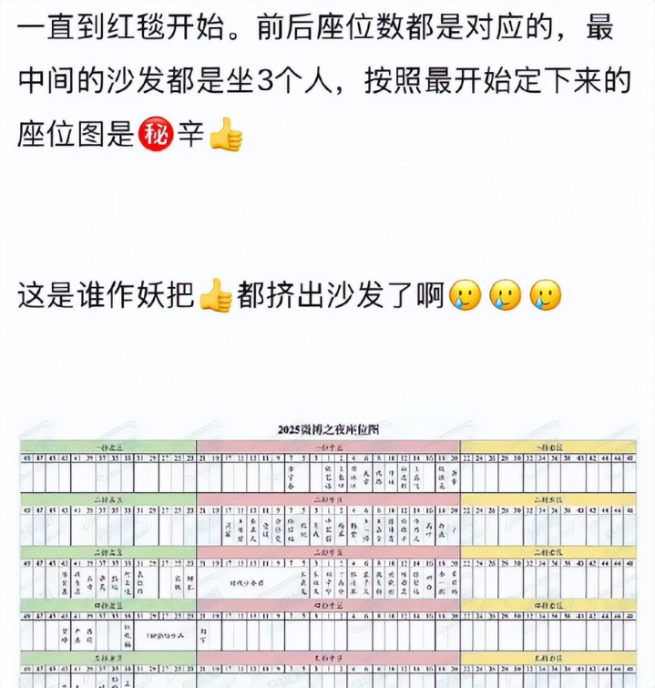 有网友爆料内情,称有人将原本定好的座位名牌撕掉,换了位置,导致第二排和第三排明星座位发生变化。