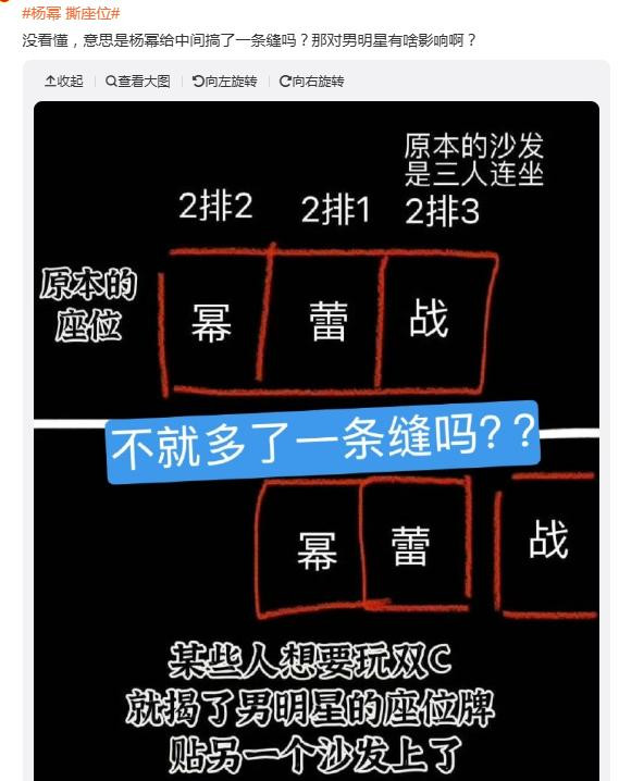 很快“杨幂撕座位”便上了热搜,网友们发现活动中稳坐C位的原本是三个人,肖战、辛芷蕾、杨幂坐在一个三人位沙发上。